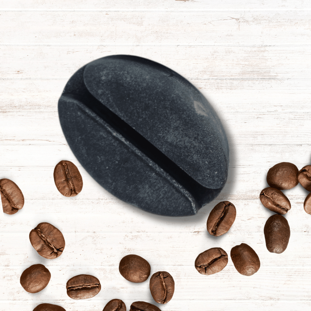 Kézműves kávészem alakú dekorszappan, fekete aktívszenes szappanból, kávé illattal, poénos ajándék kávé imádóknak.