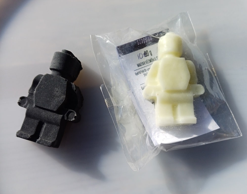 Legoember formájú, egyesével csomagolt mini szappan, többféle illatban választható.