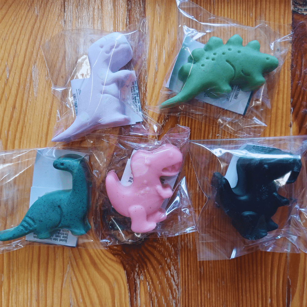 Dínó formájú, egyesével csomagolt mini szappan, többféle illatban választható. Többféle fajta dínó.