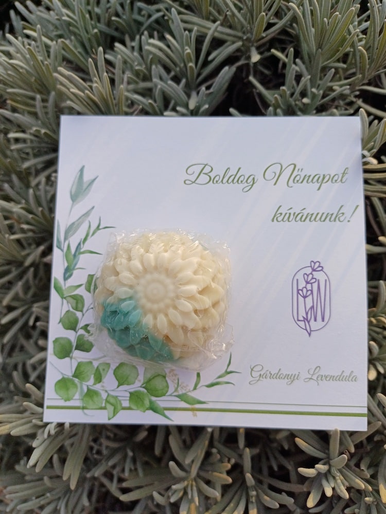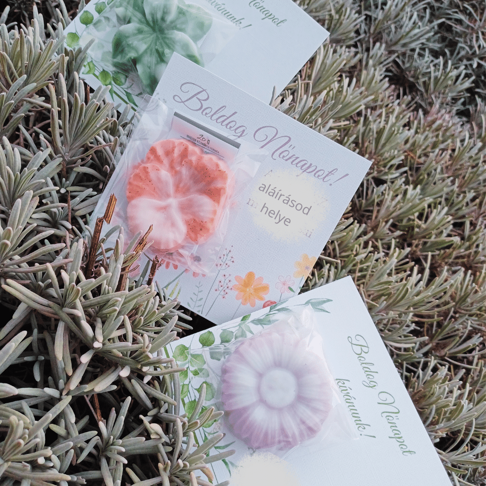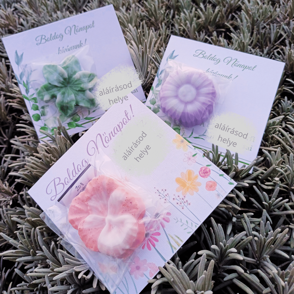 Vegyes formájú, egyesével csomagolt mini szappan virág, elegáns képeslapon, üdvözlettel.